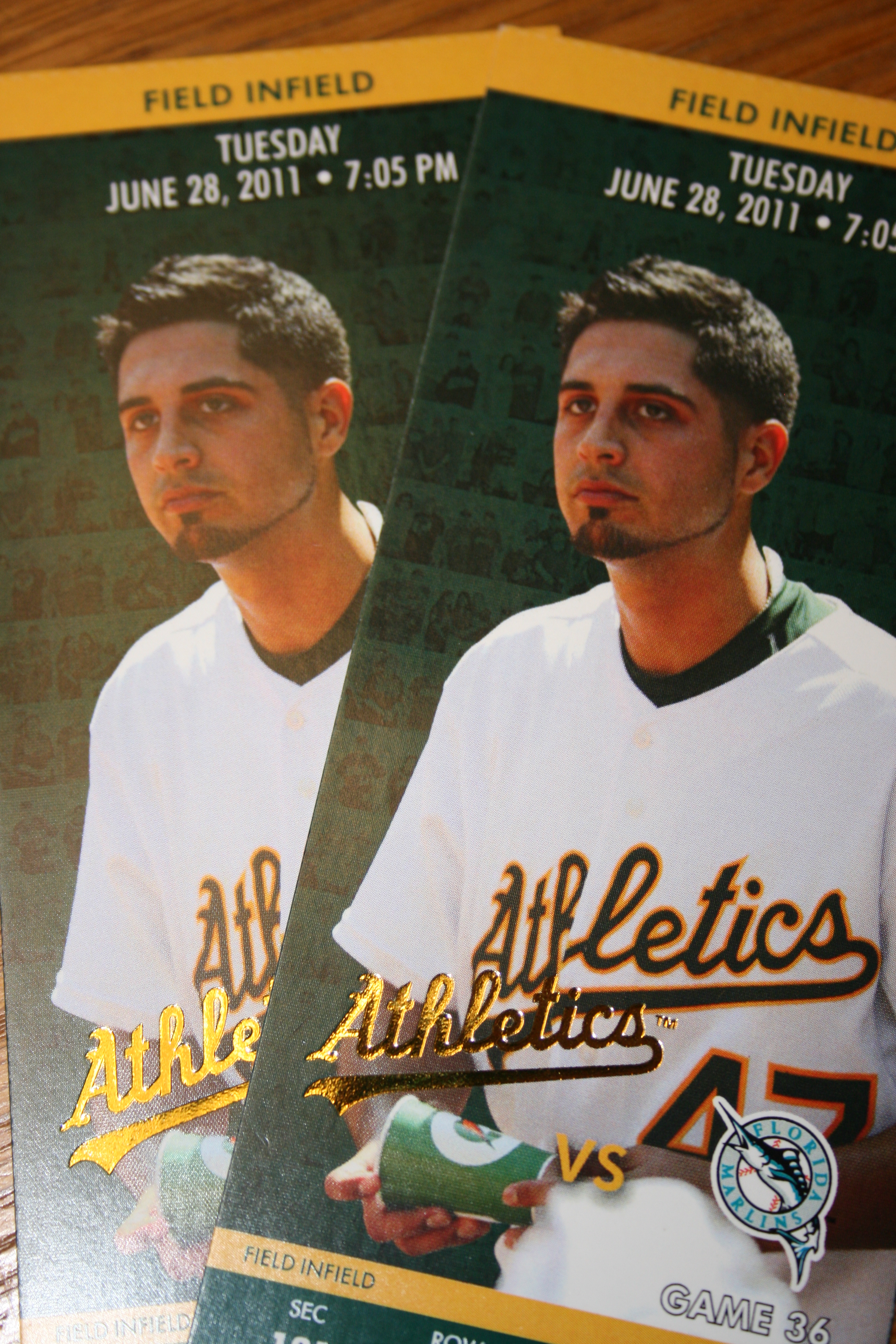 As mentioned on our @ticketservices Twitter feed, Gio Gonzalez was on last night’s Season Ticket commemorative ticket stock. Every offseason, shortly before the thick of the holiday season, a few of us in the Ticket Operations Department pour over photos, creating a theme, and assigning each photo to specific games throughout the season. We want each ticket to be unique and we hope that each ticket will be memorable. Consolidated Printing, the company that prints the tickets, then helps with the design. We recently placed Trevor Cahill on a night that he pitched, similar to Gio’s ticket last night. Boy, did Gio pitch a gem last night or what? A leadoff hit by the Marlins and then not another the rest of the night. A’s win 1-0. We called that one in December.