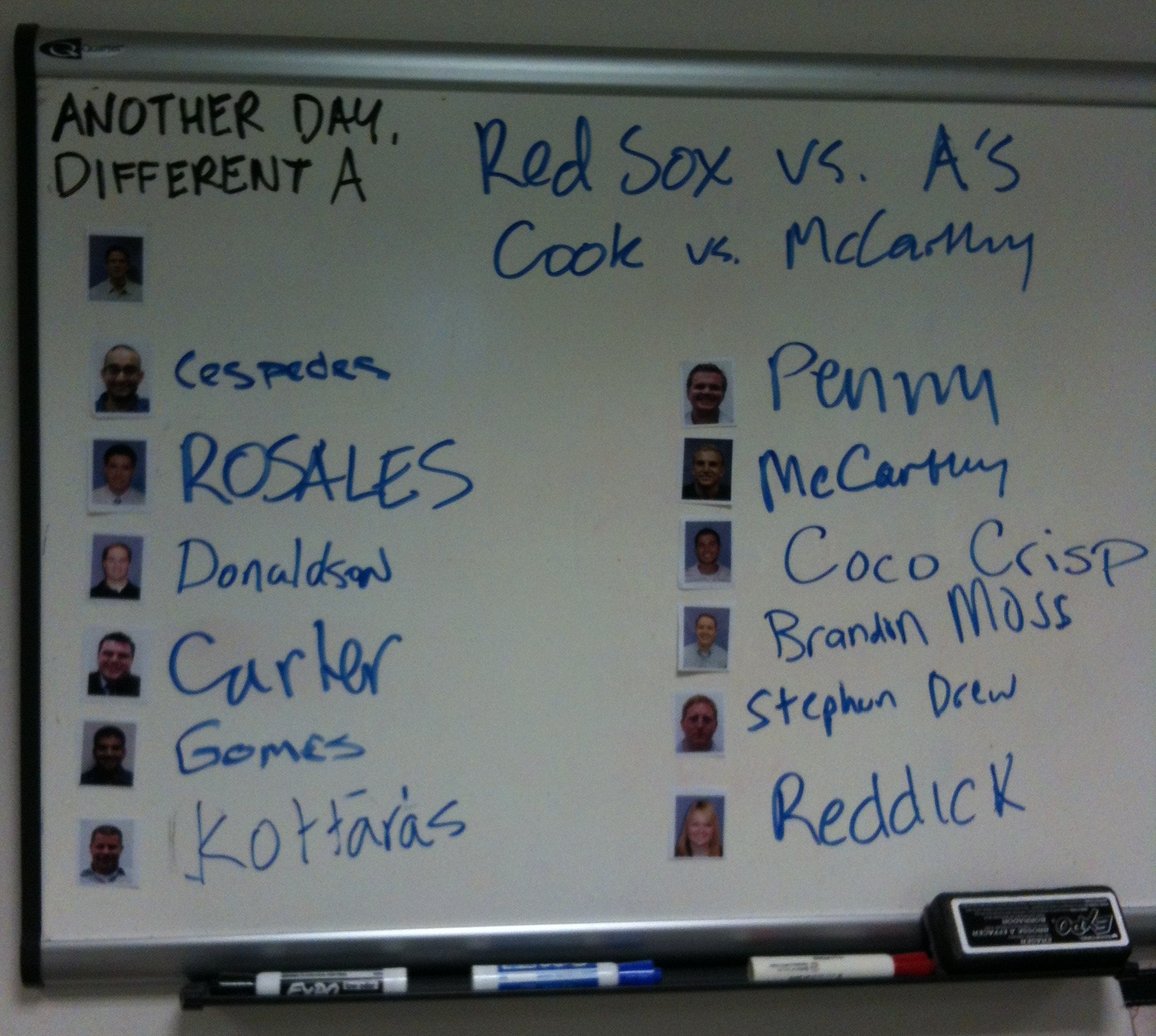 It seems like someone different is stepping up for A’s each game to seal the victory. One day Chris Carter hits a three-run bomb, another day A.J. Griffin goes perfect through 5 innings en route to another win. Maybe Pennington goes 4-4 with 2 RBI and 2 runs. With that in mind, we’ve started a new game in the Ticket Office. It’s called “Another Day, Different A”. The way it works is each person in the department picks the player they think will step of for the A’s and be the top performer that game. Any player is available and can be selected more than one person. The photo shows the board from the Friday night demolition of the Red Sox, that ended up finishing 20-2. How do you pick who was the top performer when the team puts up 20 runs? To keep it fair, we use ESPN’s Scorecenter app which shows the ‘top performer’ from each team once the game goes final. That night it was Brandon Moss, who went 4-5 with two doubles, a home run, 4 RBI and 4 runs scored. We’re keeping track of who gets the most correct selections and the winner at the end of the year will win a PTBNL (prize to be named later).