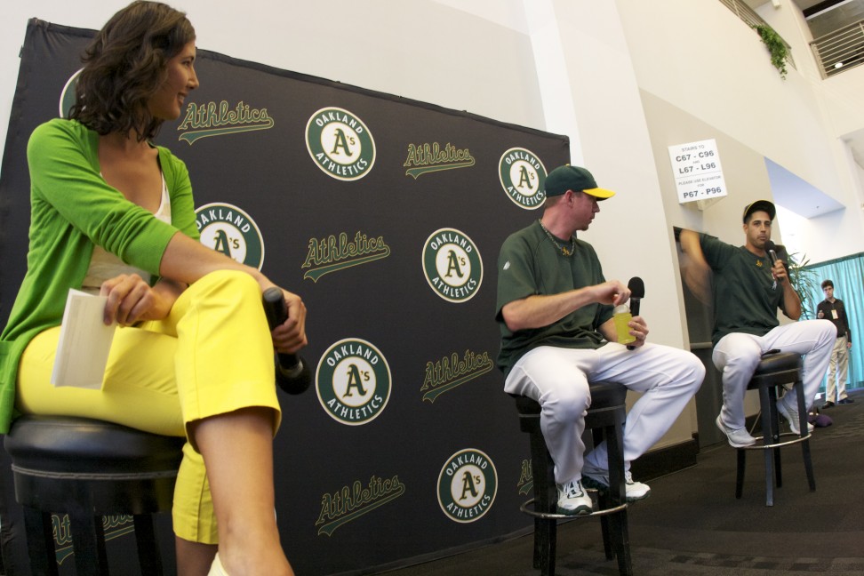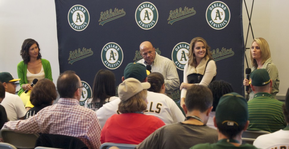 After the player panel, A’s radio voice Vince Controneo (@vincebaseball), Comcast SportNet California on-air personality Kate Longworth (@KLongworthCSN), and the Twitter sensation/wife of the night’s home team starting pitcher Amanda McCarthy (@Mrs_McCarthy32) all sat down with Kara to discuss how Twitter enhances their daily lives. Vince claims he doesn’t know what he’s doing on Twitter, but clearly, as one of the few MLB broadcasters on Twitter, understands how to harness the power of social media. He uses Twitter to interact with fans and stay on top of breaking news around the league. Kate, both a reporter and A’s fan, appreciates the personal viewpoint that Twitter provides fans. She recounted a recent connection she made with an out-of-state A’s fan that coined the term “Fosse Posse” and then attended his first home game in Oakland, where he got to meet Ray Fosse. Twitter provided the platform to make these connections happen. Amanda discussed the thrill of tweeting with people and then coming face-to-face, realizing the person you’re tweeting might be seated right behind you at the ballpark.