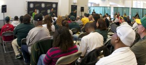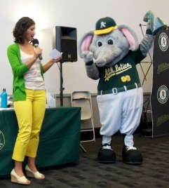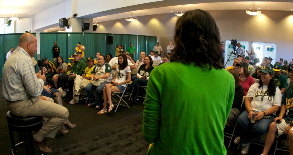 Two of the A’s most savvy social media users, pitchers Gio Gonzalez (@GioGonzalez47) and Brad Ziegler (@bradziegler), sat down with Kara in front of the crowd to answer questions that fans tweeted us before and during the event. A few off-the-cuff highlights from the players… When asked what other position he’d play besides pitcher, Gio said he couldn’t play infield because he doesn’t like wearing a cup. Asked about their uniform choices, Brad doesn’t wear stirrups because it’s too much gold for his taste, to which Gio replied he wants to go with an all gold uniform. Brad was asked and talked about the importance of his foundation Pastime for Patriots.