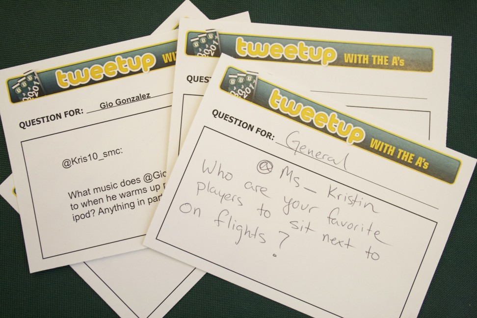 We hosted our inaugural Tweetup last night. It’s like a “meetup” except it’s Twitter.com users (who “tweet”) that follow the official A’s feeds @Athletics and @ticketservices. A special Plaza Level ticket allowed early access to the Eastside Club before the evening’s game where guests were treated to question and answer sessions with A’s players and personalities, hosted by Kara (@karashotcorner), while nibbling on inclusive food and beverages.